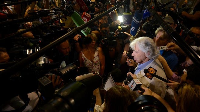 Lawyer Genry Reznik (R) speaks with journalists inside Terminal F of Moscow's Sheremetyevo airport, on July 12, 2013 before a meeting with fugitive leaker Edward Snowden. Snowden possesses data that could prove far more "damaging" to the US government but the fugitive leaker has chosen not to release them, said a journalist who first broke the story.AFP/File